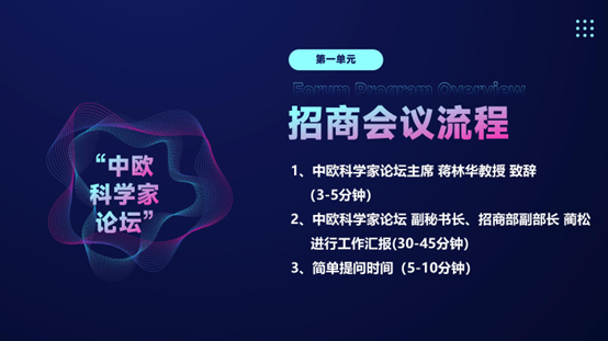 2024年8月3日,星期六,中欧科学家论坛招商会在线上顺利开展,招商会由中欧科学家论坛副秘书长,招商部副部长蔺松主持,中欧科学家论坛蒋林华院士致辞,会议旨在介绍论坛的创建背景及各分论坛的具体信息,并详细解答了合作方式与招商模式。
