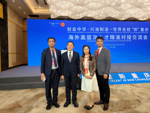 (从左至右:中欧科学家论坛组委会副秘书长侯君,重庆市侨联副主席罗强,组委会副秘书长肖灵艳,科技经贸分论坛副主席窦豆)