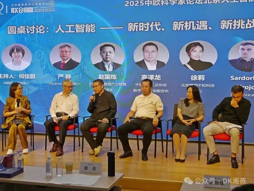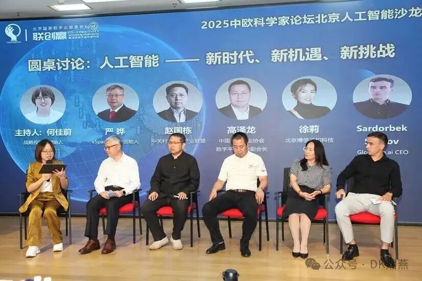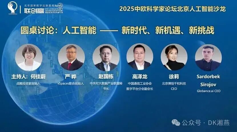 2025年9月14日 16:00-17:00,2025中欧科学家论坛北京人工智能沙龙 “人工智能 —— 新时代、新机遇、新挑战”主题圆桌讨论在北京国家数字出版基地如期举行。本次圆桌对话由战略投资家、CIBA 新经济创始人何佳蔚主持,汇聚 xSpaces联合创始人严晔、中关村大数据产业联盟秘书长赵国栋、中国通信工业协会数字平台分会副会长高泽龙、北京博恒千和科技CEO徐莉、Globance.ai CEO Sardorbek Sirojov(下称 “Jack”)五位跨领域嘉宾,围绕 AI 技术跃迁、产业落地、中欧协作等核心议题展开深度对话,为全球AI发展提供兼具实践温度与全球视野的洞见。